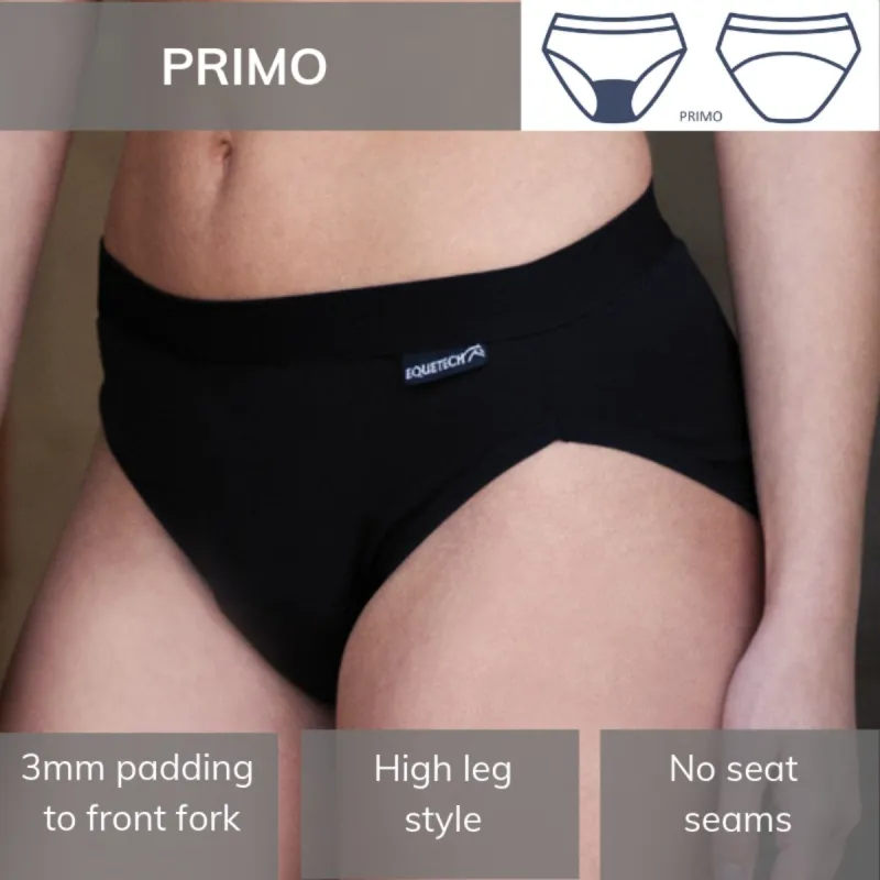 Ropa interior braga acolchada especial deporte equitación para mujer con acolchado Primo (discreto) en zona asiento y/o pelvis. Arco de pierna bajo.