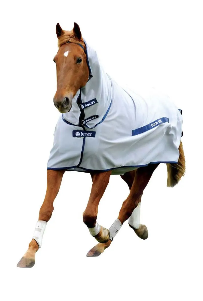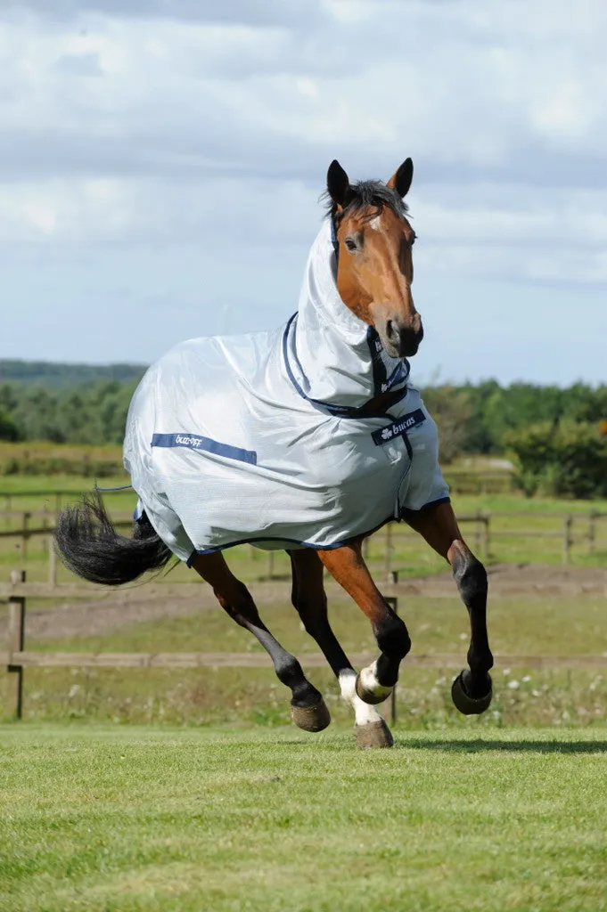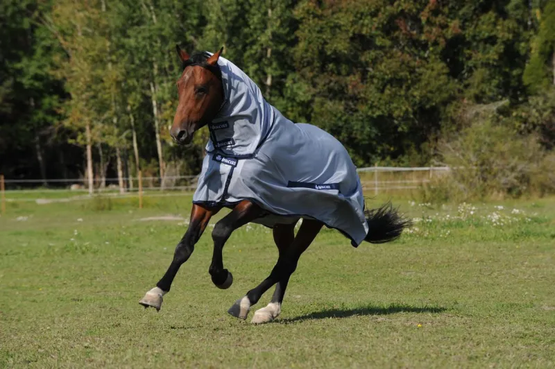 Manta para caballo, OUTLET en perfecto estado . Color Plata con ribete azul. Con capucha cuello para control de insectos o anti-moscas con protección de radiación ultravioleta (UV). Tejido técnico fino de ventilación.