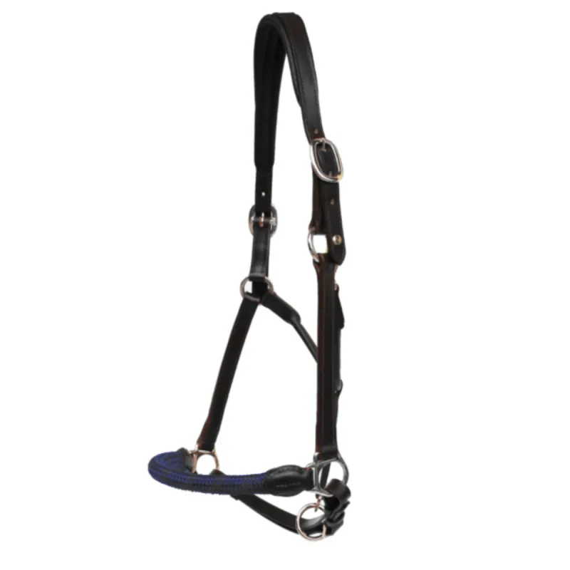 Confeccionada en cuero italiano de plena flor con costuras en el mismo tono que la piel. Esta cabezada de cuadra ha sido diseñada con una muserola de cuerda gruesa, que ejerce un efecto mas firme en el control del caballo pie a tierra. Provista de una testera acolchada con suave cuero que garantiza el confort del caballo y laterales ajustables en ambos lados para conseguir un ajuste perfecto. También permite regular la longitud de la correa de la barbilla y el ahogadero se engancha fácilmente mediante un mosquetón. Todas las fijaciones se presentan en acero niquelado.
