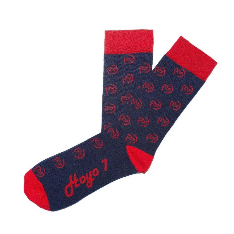 Calcetines unisex con logo Hoyo 7 en color azul marino y detalles en rojo. Caña media.