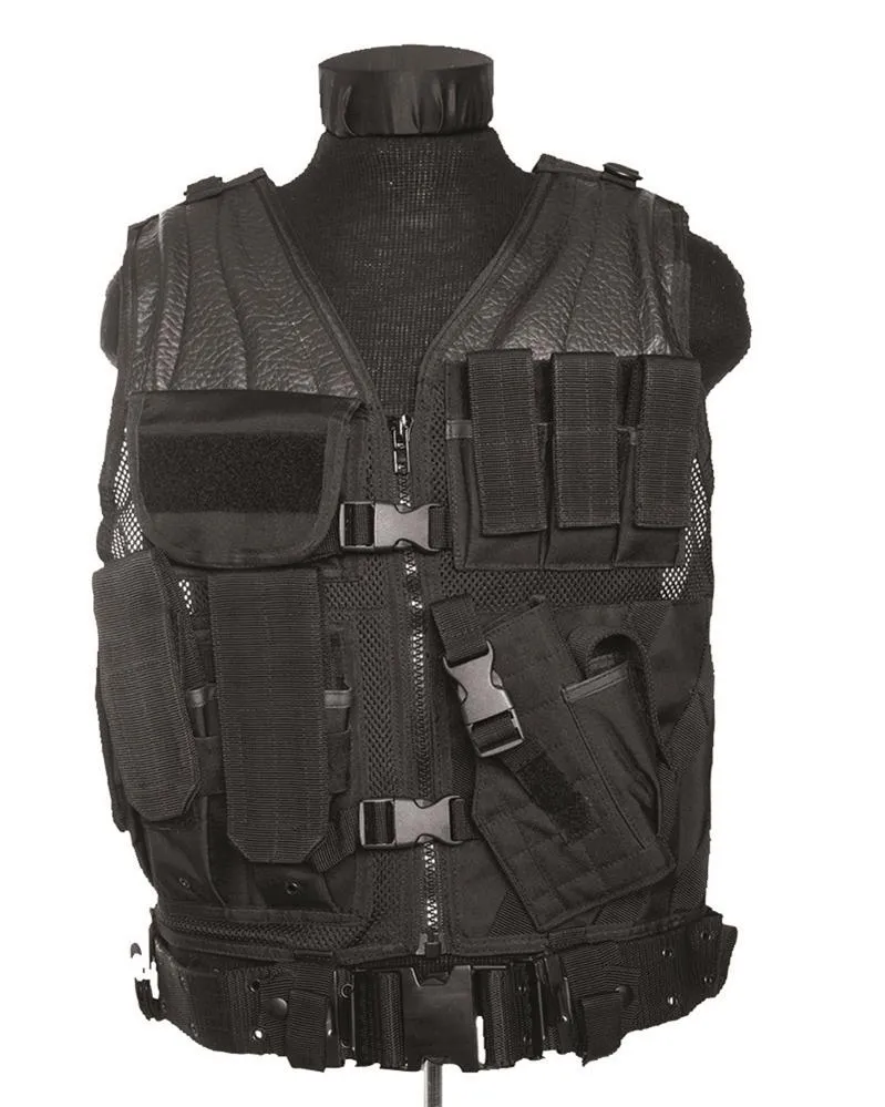 El chaleco se cierra con cremallera en la parte delantera y se puede asegurar adicionalmente con un cinturón de pistola (incluido) enhebrado a través de los lazos en la parte inferior.