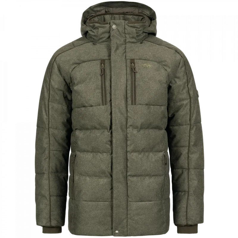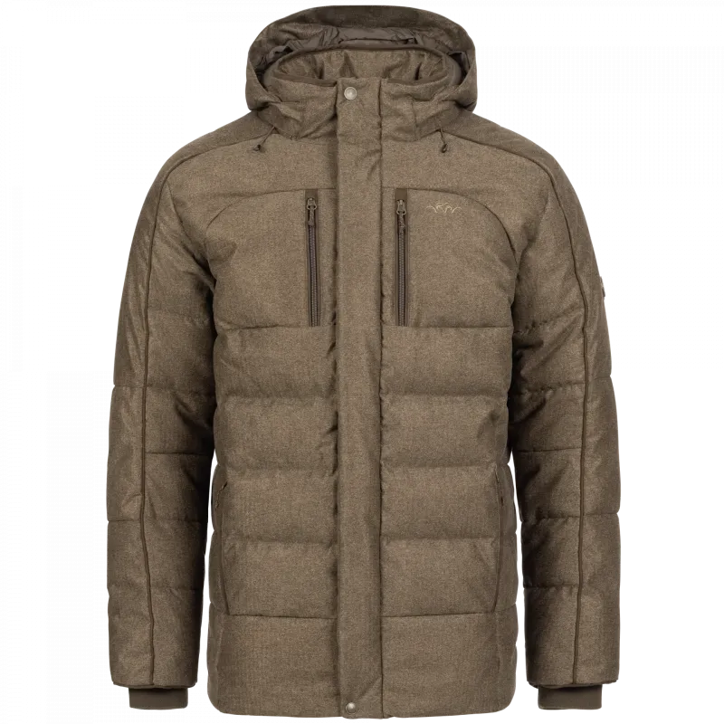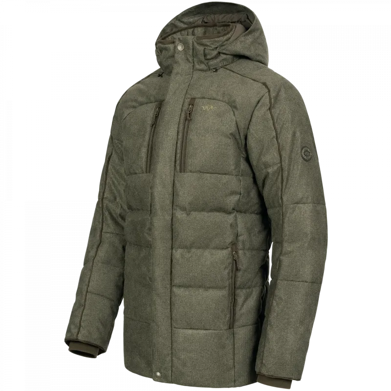 Chaqueta de plumón hecha de tela Blaser Vintage de 2 capas, aislamiento híbrido con plumón en las zonas del núcleo del cuerpo y parte superior de los brazos para una alta calidez, Primaloft® Black Rise se utiliza para los hombros y el área debajo del brazo maximizando el calor y la transpirabilidad y secado rápido, capucha extraíble con ajuste de 2 puntos, 2 bolsillos con cremallera en el pecho, 2 bolsillos laterales con cremallera y forro cepillado, elegantes detalles de ante sobre los brazos, el cuello y los bolsillos, puño de vellón separado, ajuste de la cintura y el dobladillo para mantener el calor, etiqueta de cuello Blaser Arcantus Scroll y insignia de brazo.