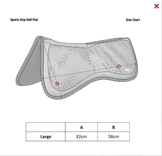 LeMieux Sports Grip Memory Half Pad La magnífica espuma viscoelástica de bajo perfil sostiene la silla y distribuye uniformemente el peso y la presión de los jinetes. Los paneles de la cama de la silla de montar en la espuma, que se vuelve más maleable y elástica a medida que se calienta. El «agarre del neumático» de silicona proporciona soporte adicional y asegura la silla en su lugar para que no se mueva .