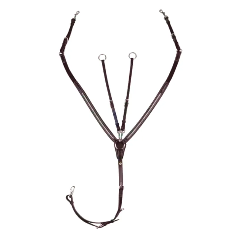 Confeccionado en cuero italiano de plena flor con costuras en tono blanco roto y todas las fijaciones con aleación de acero niquelado. Su diseño incluye inserciones decorativas de nickel plata en las correas laterales. Con 3 puntos de fijación a la montura, este pechopetral garantiza el mantenimiento de la posición de la montura sobre el caballo. Diseñado con unas correas laterales acolchadas con suave cuero y con secciones elásticas que ofrecen un mejor ajuste y libertad de movimiento. La anilla que une los 2 laterales a la cincha está protegida por una solapa acolchada con silicona y cuero suave. Todas las fijaciones son ajustables y desmontables. La correa que se une a la cincha está provista con dos anillas en D, que permiten añadir otros accesorios para el entrenamiento y cuenta con un mosquetón resistente, extraíble, que facilita su rápida colocación.