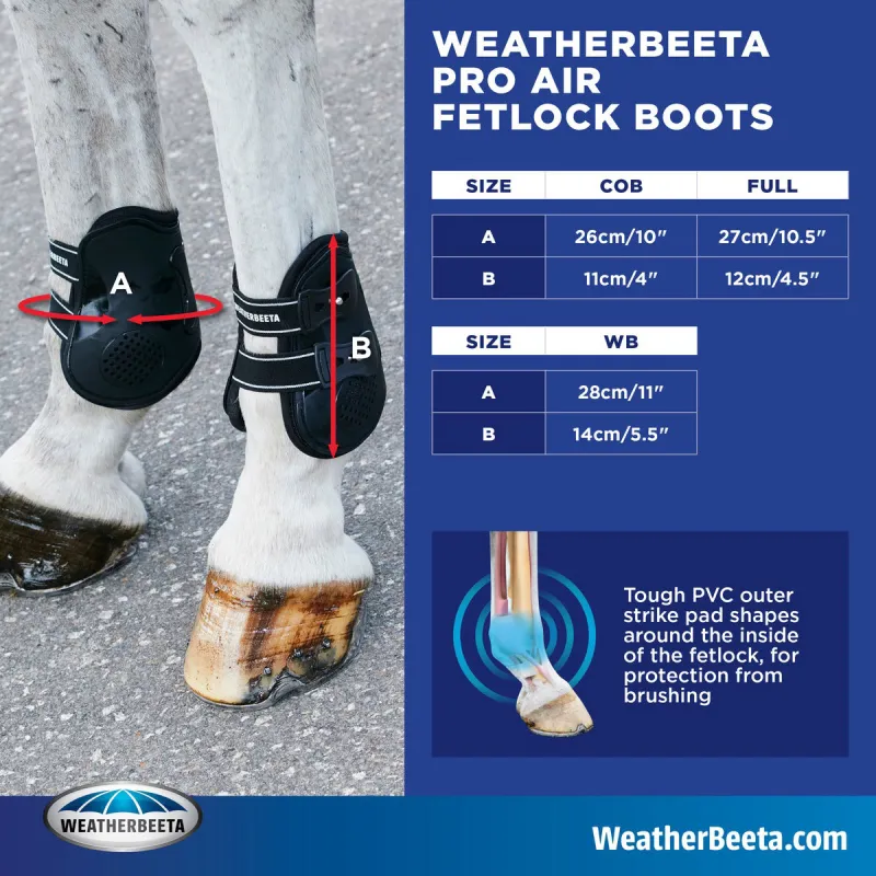 Los Protectores de Pies WeatherBeeta Pro Air Fetlock tienen un exterior ligero, resistente y duradero con un forro de neopreno microperforado transpirable que se adapta a la pata del caballo para ofrecer la máxima comodidad y protección. Presentan respiraderos para la transpiración desde la capa interna hasta la capa externa