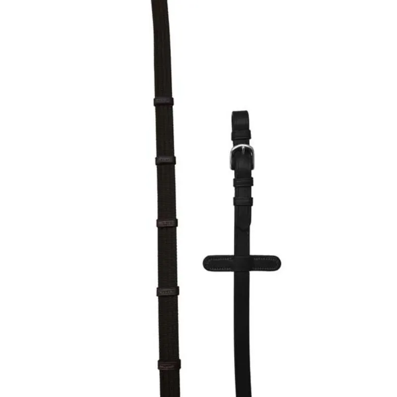 Cómodas y resistentes riendas confeccionadas con las mejores pieles italianas de grano completo, en la seccion que se une a la embocadura. La seccion que va a la mano del jinete esta fabricada en lona engomada antideslizante y nueve topes que facilitan un firme agarre. Provistas de hebillas de acero niquelado. para su sujeción.