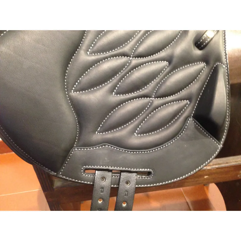 Silla de montar de cross con diseño monofaldón, cubierta con suave piel de ternera de grano completo. Piel confeccionada especialmente para garantizar una excelente adherencia, que asegura la estabilidad de las piernas del jinete. El diseño monofaldón y las largas correas para la cincha proporciona un contacto único entre la pierna del jinete y la caja torácica del caballo, así como una reducción del peso de la silla. Para hacer esta montura exclusiva, se pueden personalizar los bordes delanteros y traseros, los ribetes de unión, los pasadores para los estribos y las costuras.