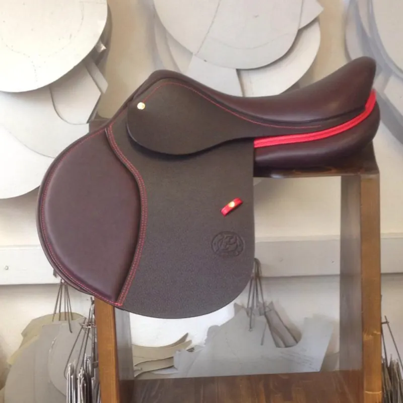 Silla de montar de salto confeccionada con sólido cuero tintado. El cuero utilizado para forrar el asiento y los refuerzos para la rodillas, ha sido especialmente desarrollado para garantizar el mejor agarre de la pierna del jinete y por tanto su estabilidad. Diseñada con paneles integrados para adaptarse a la morfología del caballo y permitir que los bastes de la silla (la parte acolchada que entra en contacto con el lomo de su caballo) está directamente unido al faldón de la silla, lo que ofrece al jinete una sensación más cercana con el caballo. Esta silla de montar de salto permite personalizar los bordes delanteros y traseros, los ribetes de unión, los pasadores para los estribos y las costuras, para disfrutar de una montura exclusiva.